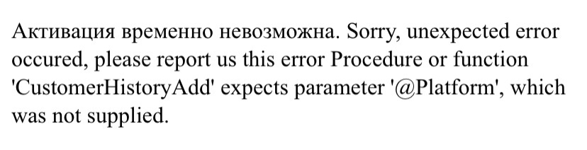 Ошибка Xvast «Активация временно невозможна. Sorry, unexpected error occured, please report us this error Procedure or function 'CustomerHistoryAdd' expects parameter '@Platform', which was not supplied»