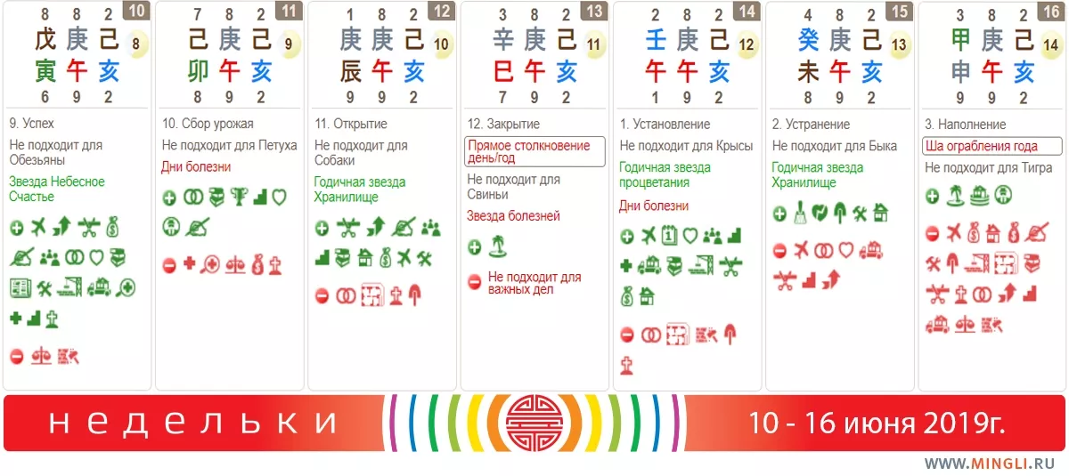 Неделю начинайте бодро, с места в карьер: большинство позитивных дел можно планировать на понедельник, 10 июня. Так что распишите денек по минуткам - и вперед! Можно также начинать ремонт и планировать перестановки и активизации, например, в часы Змеи или Петуха; более поздние часы Собаки и Свиньи также можно использовать, но они не такие сильные. Если вы знаете свой элемент да гуа (не гуа!) года рождения, эти часы подходят тем, чей элемент 2, 3, 7 или 8.