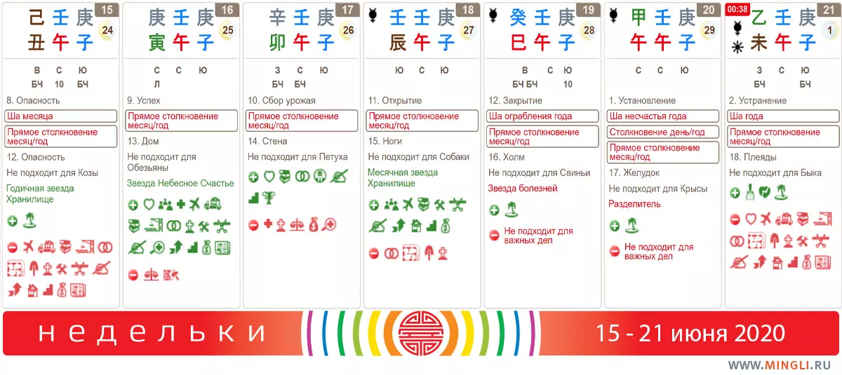 20 июня, суббота. Постарайтесь отдохнуть тихо и мирно, особенно если Лошадки и Крыски бунтуют в вашей карте бацзы. День точно не подходит для свиданий, выяснения отношений, перестановки супружеской кровати, подписания документов о дружбе, любви или объединении людей в сообщество. Не стоит заниматься экстремальными видами спорта.