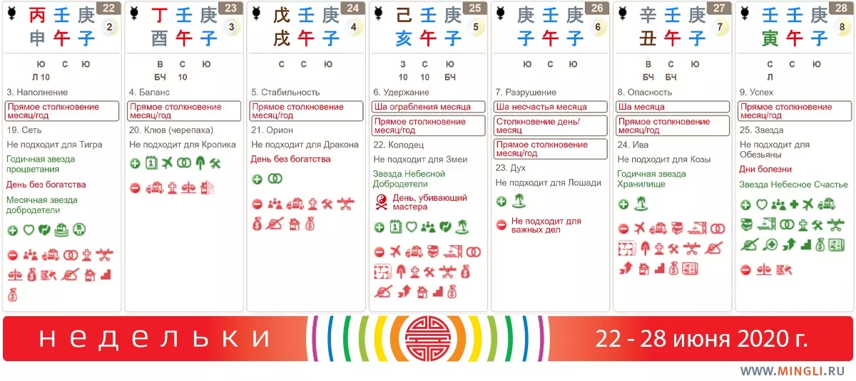 27 июня, суббота. Не планируйте дела, которые надо успеть сделать в срок - возможны задержки и замедления. Чрезмерная активность принесет много забот. Если для вашей карты бацзы актуален вред Лошадь-Бык - сегодня будьте внимательны, не совершайте необдуманных поступков.