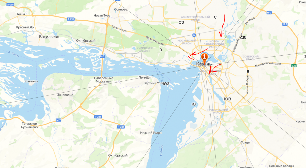 Когда мы анализируем Фэн Шуй городов, первое правило — это смотреть на то, что бросается в глаза (как в физиогномике и в других науках китайской метафизики) – получить впечатление. И тут нам с вами бросается в глаза слияние рек Волги и Казанки на Юго-Западе. Это слияние будет одним из многочисленных «водных ртов» рядом с городом.