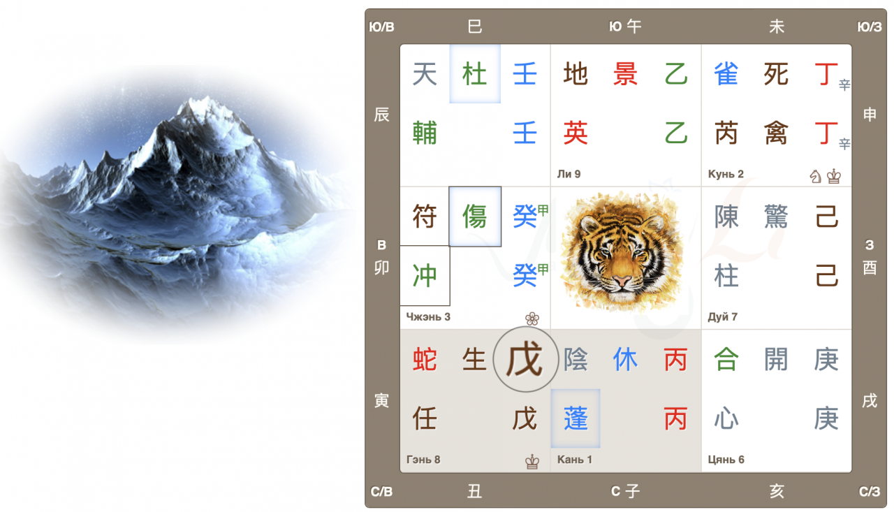 Дворец Чжэнь, движение Дерева, начало нового, быстрый рост. Врата ранения 傷 находятся в своем домашнем дворце и являются главными в раскладе. Это очень активные, азартные врата, жаждущие перемен, перемещений и поездок. Настала весна, время двигаться, и люди этого хотят. Да и родная звезда 冲 также добавляет мощный импульс для начинаний.