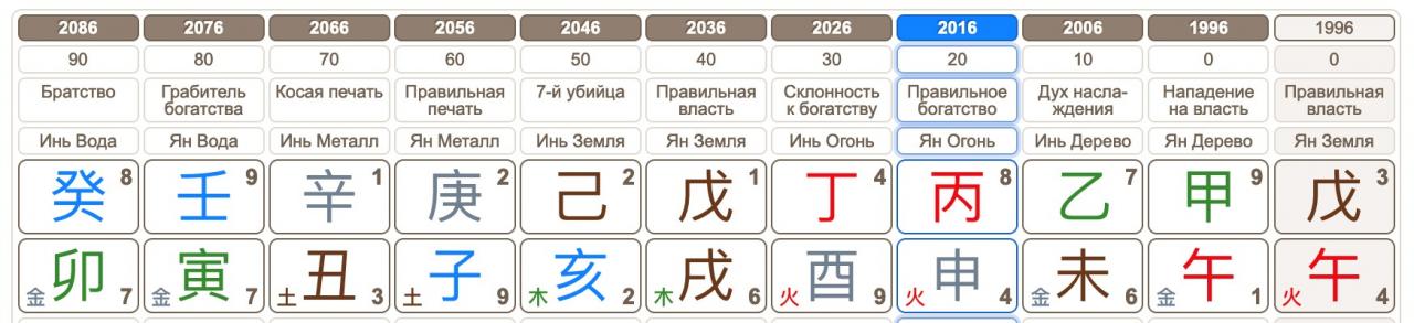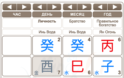 Это его Бацзы. По событиям карта сильная, Господин Дня – Вода Инь (Гуй). Полезны Огонь и Дерево. Часа рождения мы не знаем, но один из полезных элементов точно можно брать и использовать – Огонь Ян в году рождения.