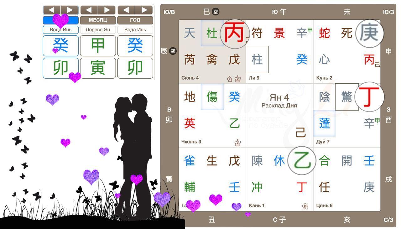 Когда же в этот день встреча ищущих сердец наиболее вероятна? Для этого пробуем найти час, в котором наши фигуранты очень заметны. Та-дамс! Есть в дне такой час! Расклад часа Петуха, в котором симпатичный丙 и трепетная 丁 опустились в те же дома, что и в раскладе дня, а значит выделяются, подпитываются фоном дня. Час Петуха активно способствует пересечению «случайных взглядов».