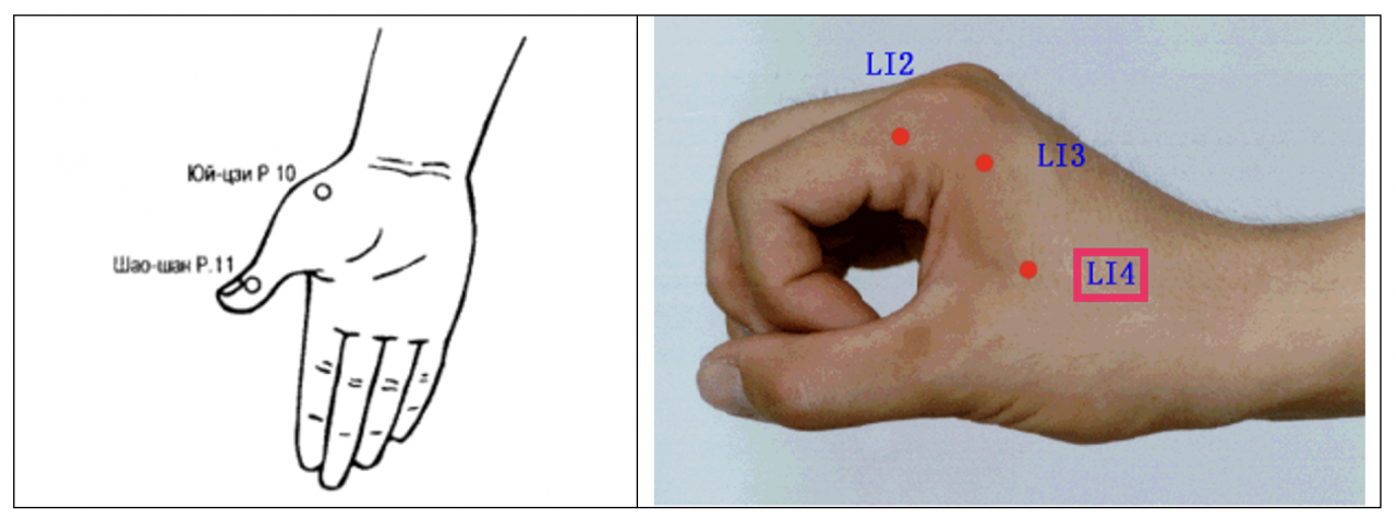 Точку Р-10 на меридиане Легких массировать в течении 30 секунд. Точку LI 4 Хэ-гу массировать в течении 1 минуты.
