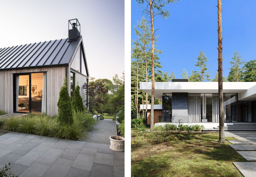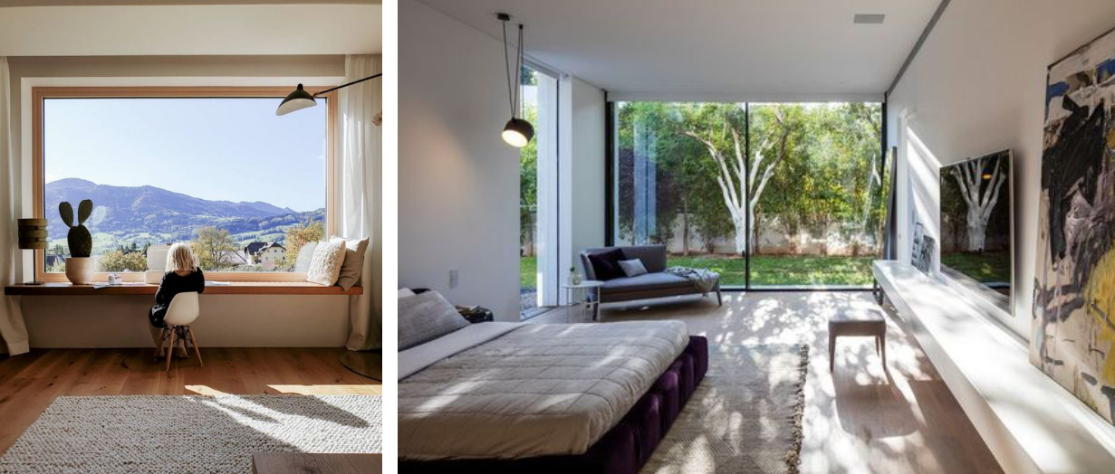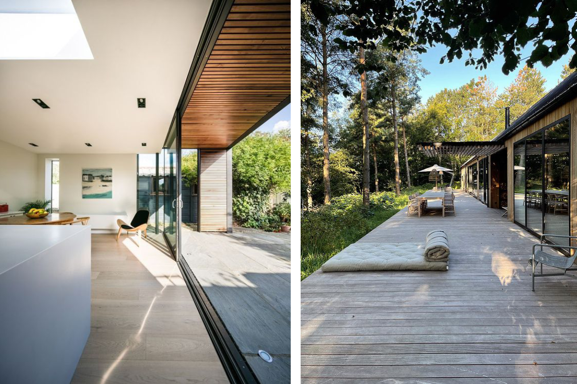 Используйте большие раздвижные панорамные окна и двери, чтобы акцентировать и связать помещения внутри с территорией вокруг. Сделать единое большое пространство, чтобы из разных помещений открывался красивый вид и было достаточно света. Только помните о балансе инь и ян, слишком больших и открытых проемов лучше не делать.