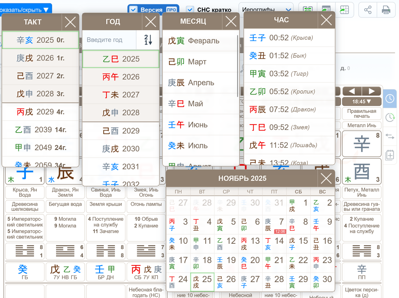 Для калькулятора Бацзы в профессиональной версии у текущего такта и столпов года, месяца, дня и часа мы разработали и реализовали уникалный интерфейс выбора даты с учетом попрвки по карте рождения или по месту проживания.