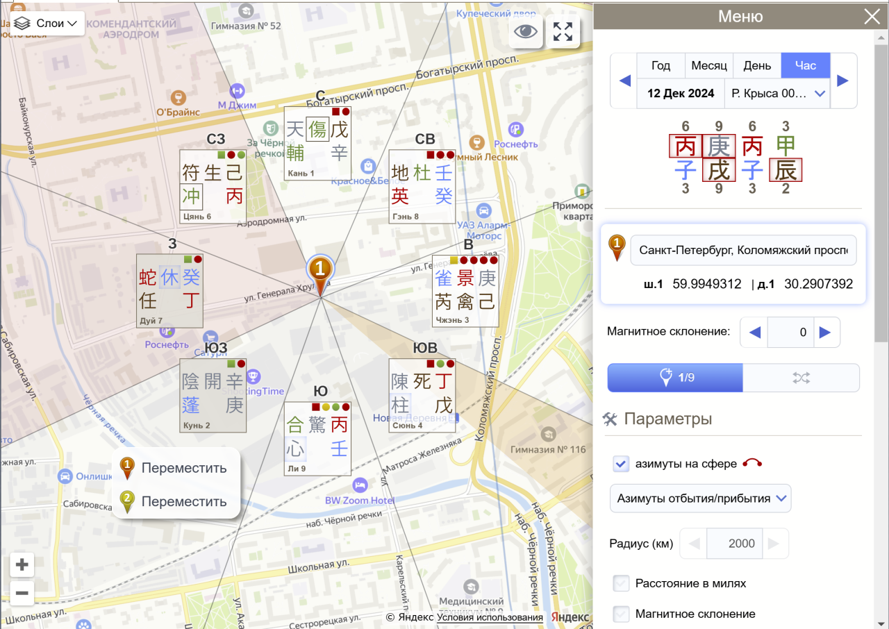 В калькуляторе Ци Мэнь мы добавили новый вариант вывода карты – с цветными дворцами, названиями иероглифов и так далее.