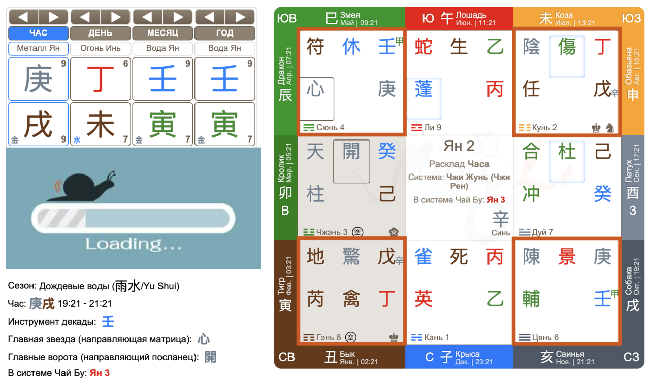 Банк 開, которого Тай Суй 癸卯 вывел из пустоты, не исполнил свою функцию, забыл сделать обновление файлов, а в это время… пришли новые требования от еще одного Инфраструктурного Посредника. Посреднику были нужны документы, которые у банка были, но он их вовремя им не предоставил. Деньги уже в банке, но еще на специальном счете, Человеку они пока не доступны. Смотрим Дворцы Кунь Человек 丁и Гэнь Деньги 戊. По расположению в раскладе видим, что они на достаточном расстоянии друг от друга. Оба оператора получают преодоление от уже нового Тай Суй 癸. Этот контроль проигрался так: все время и всем нужно что-то пояснять, просить, напоминать, хотя именно Человек здесь и является пострадавшей стороной!