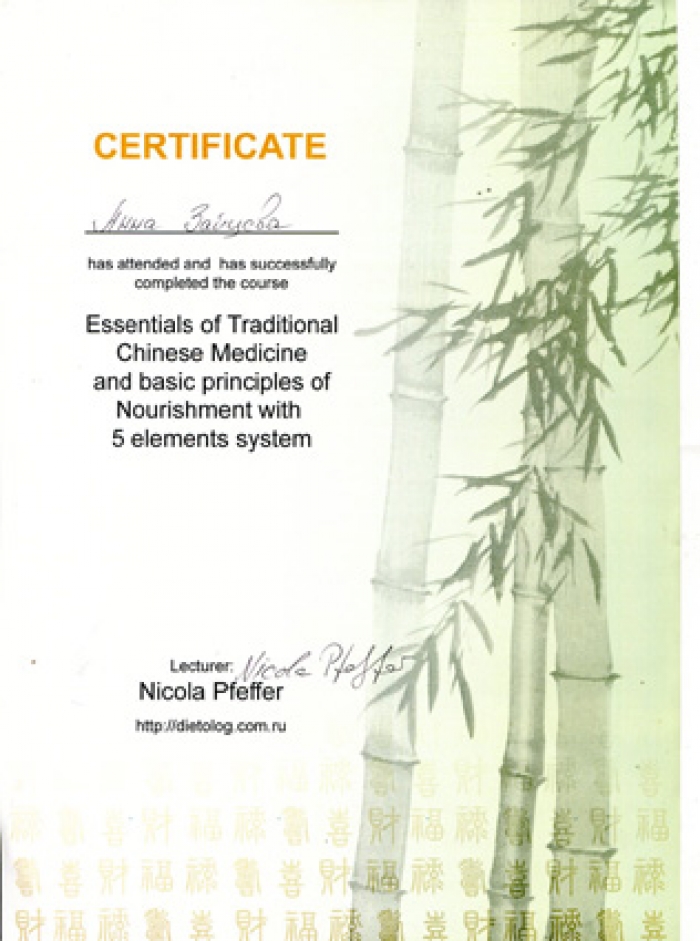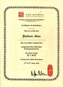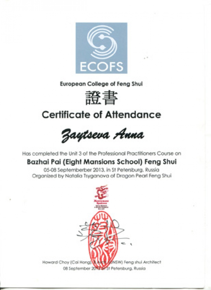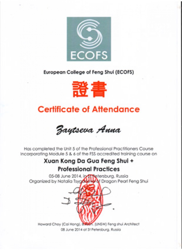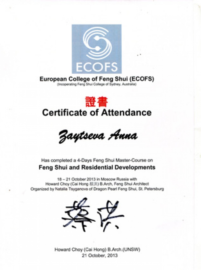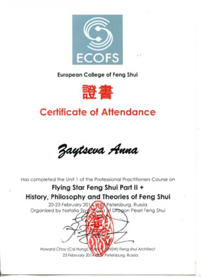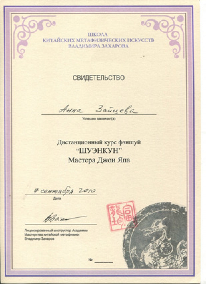 Училась у признанных мастеров: Владимира Захарова (Mastery Academy of Chinese Metaphysics), доктора Манфред Кубни (IATCA), Джерри Кинга, Говарда Чоя Европейский Колледж Фэн Шуй (ECOFS), Мастера Мими, Николы Пфеффер, Мастера Джозефа Ю, Миланы Минаевой, Оксаны Сахрановой, курс мастера Benson Yeo и других мастеров. Увлекаюсь изучением философии и истории Китая. Мой Наставник по Ци Гун (氣功) Мастер Чень Цзие, ученик Мастера Лю Баочана, который был учеником прославленного Ли Цуньи.