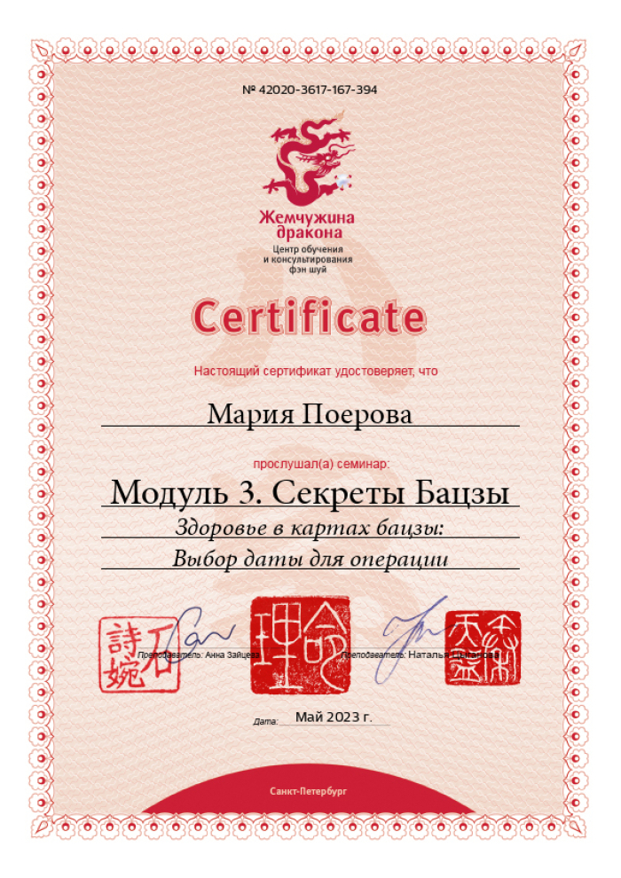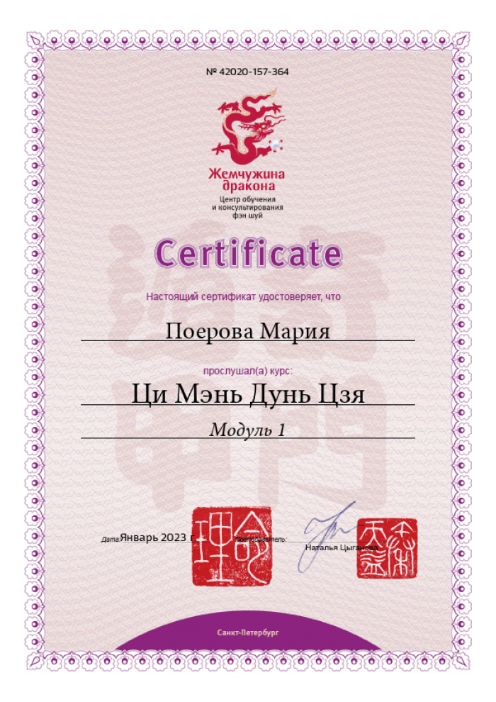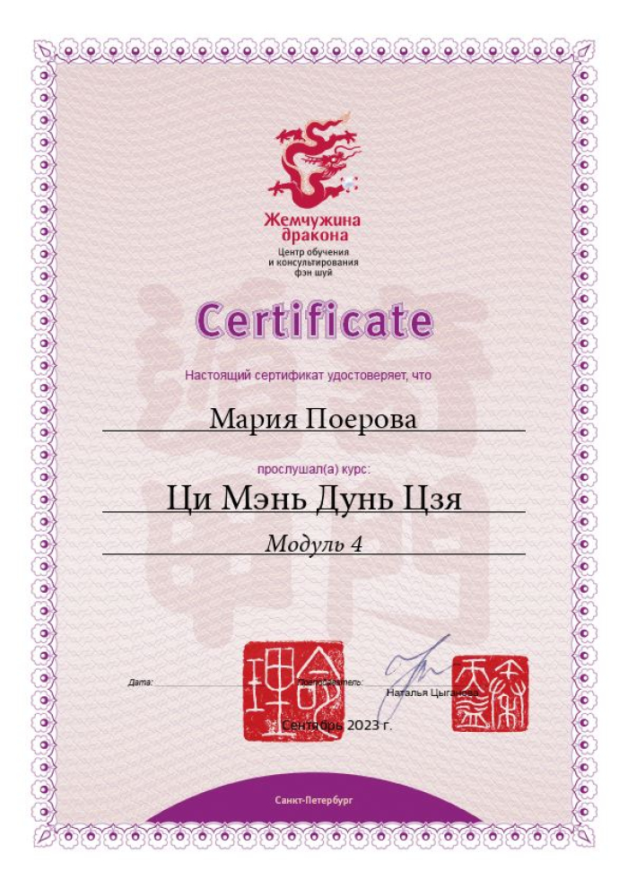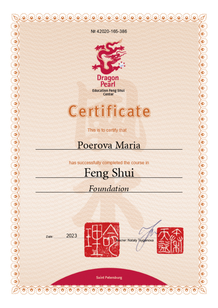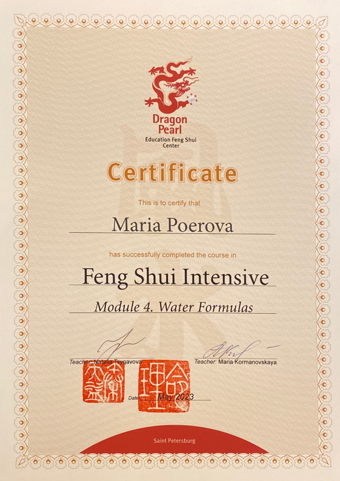 Меня зовут Мария, я сертифицированный консультант центра «Жемчужина Дракона» по фэн-шуй и бацзы.