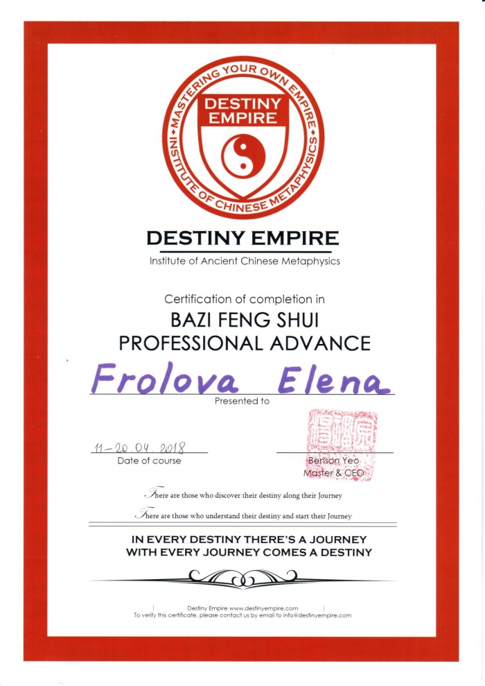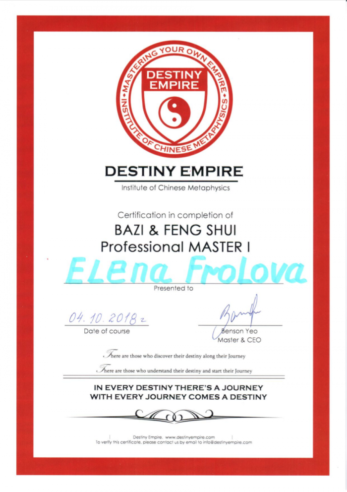 Открыла для себя инструменты Фэн Шуй, На Инь, Ба Цзы. В 2011 году вошла во «волшебные врата» Ци Мэнь Дунь Цзя, которые стали «точкой опоры» на пути перемен.