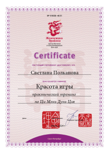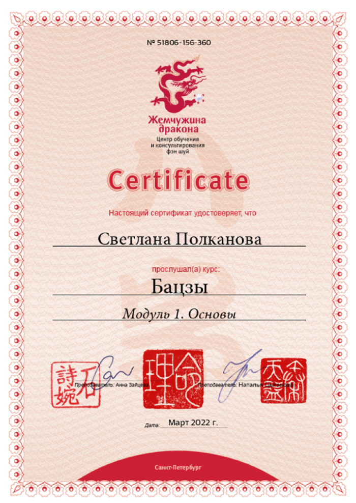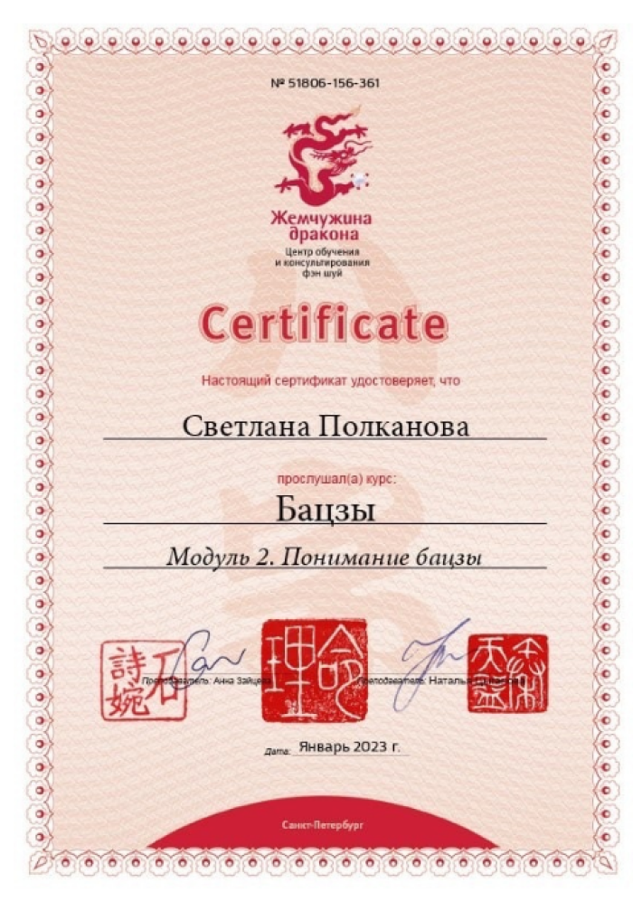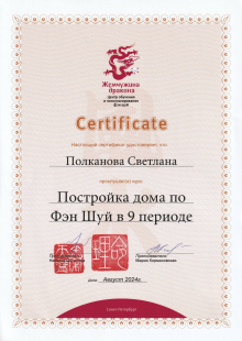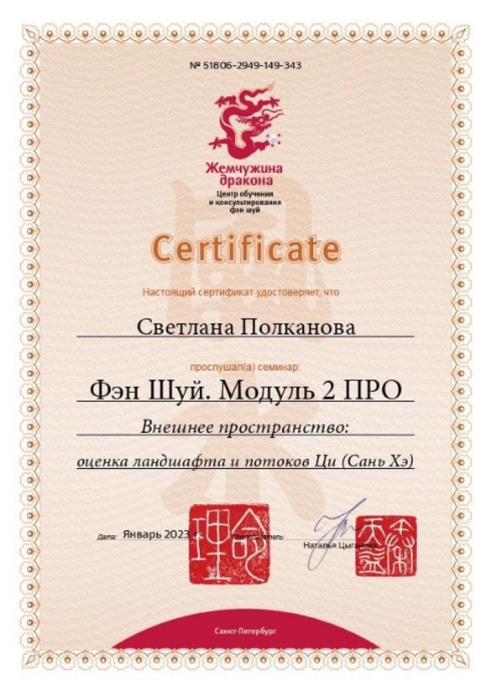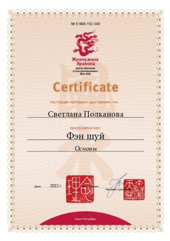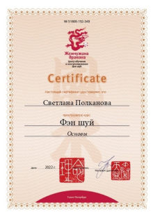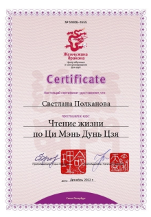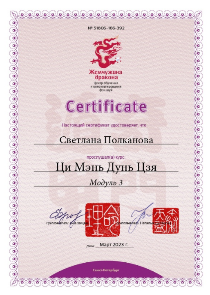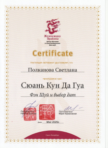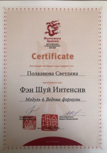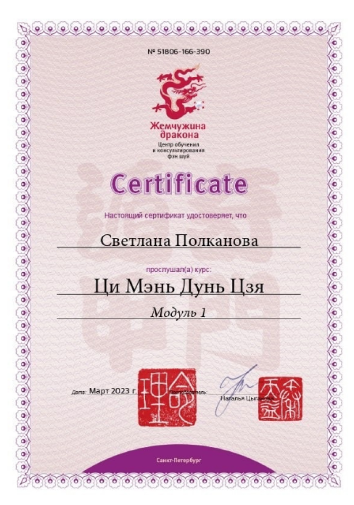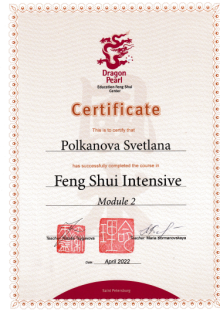 В китайской метафизике я прошла полный цикл обучения: Ба Цзы, Фэн Шуй, Ци Мэнь Дунь Цзя. Все курсы завершены, знания подтверждены сертификатами.