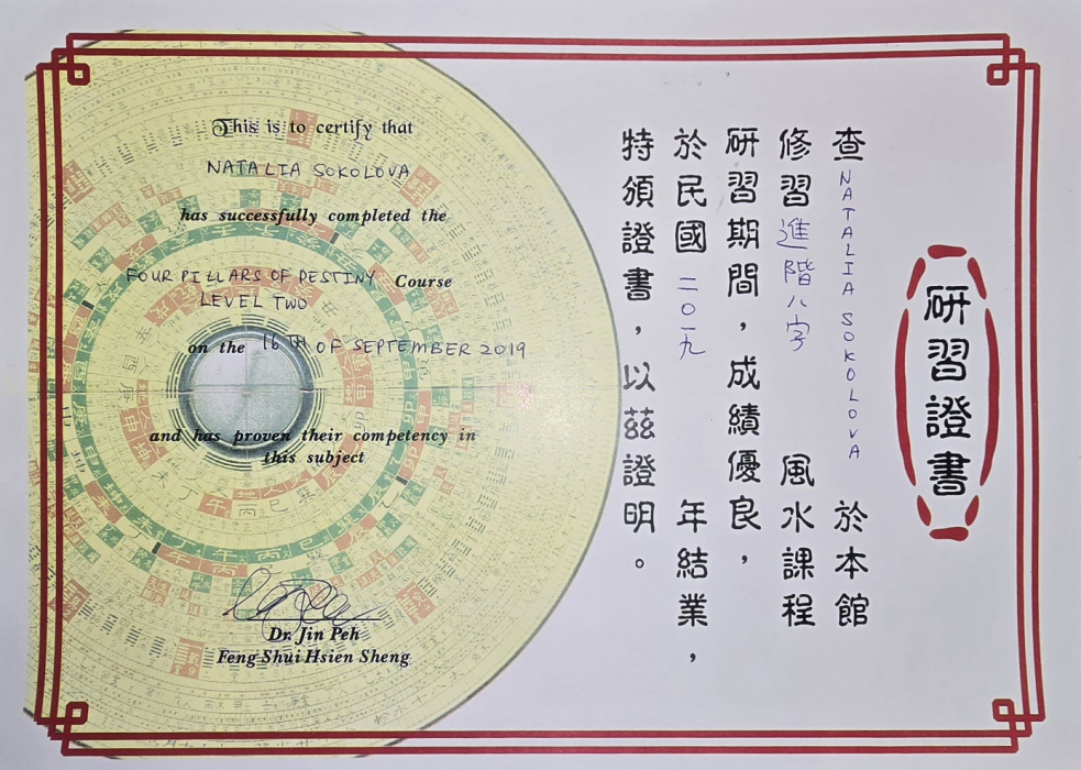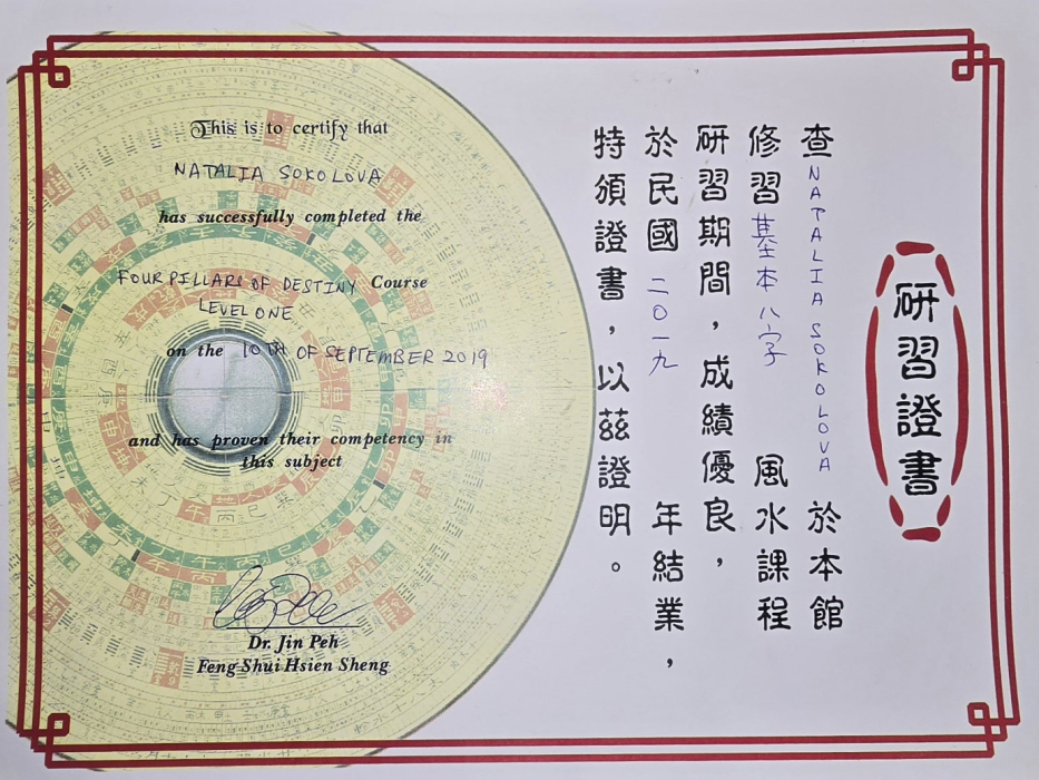 Я – сертифицированный консультант по бацзы от центра обучения и консультирования «Жемчужина Дракона». Также я являюсь сертифицированным инструктором по «Практикам Вселенского Дао».