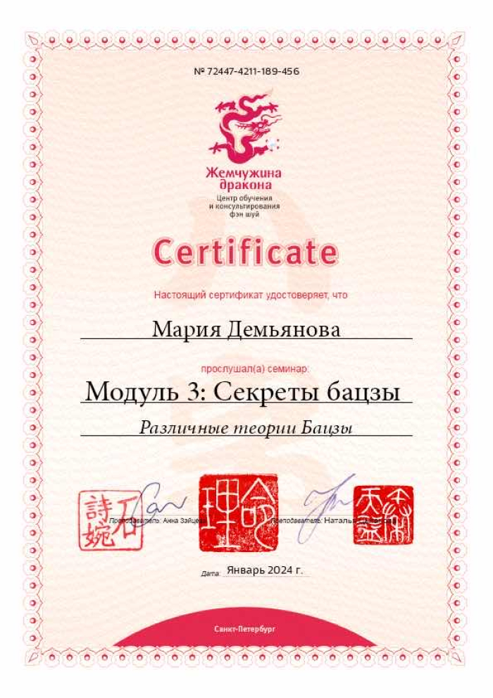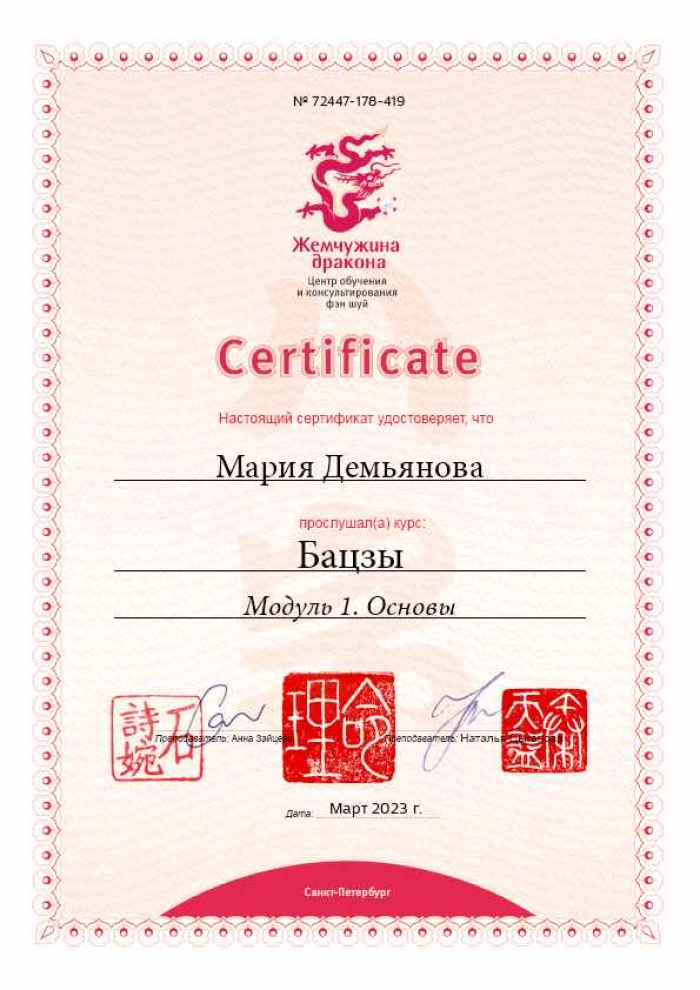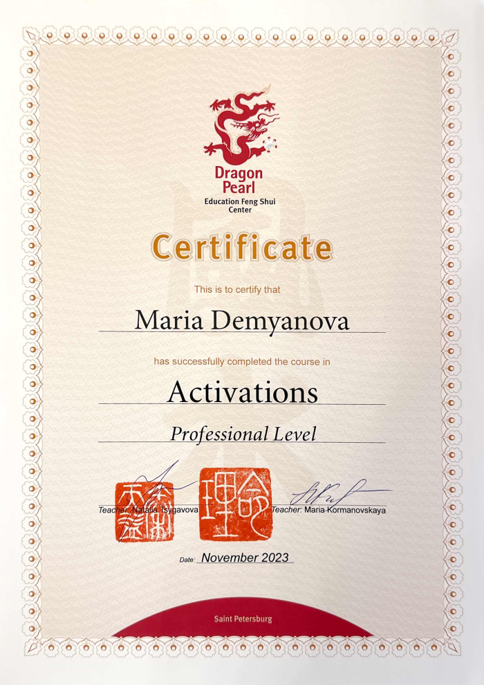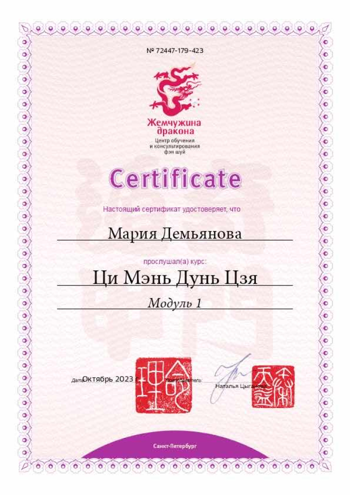 За последние годы я решила систематизировать свои разобщённые знания по фэн шуй и другим наукам китайской метафизики, за что безмерно благодарна школе Mingli, в которой я приобрела прочный фундамент по фэн шуй, бацзы, ци мэнь дунь цзя. Также мне посчастливилось пройти «золотой стандарт Сань Хэ», включающий императорский фэн шуй, внешний и внутренний Сань Хэ, у Мастера Вин Лео, а также пройти курс «Летящие звёзды Сань Юань» по лицензии Мастера Френсиса Леяу.