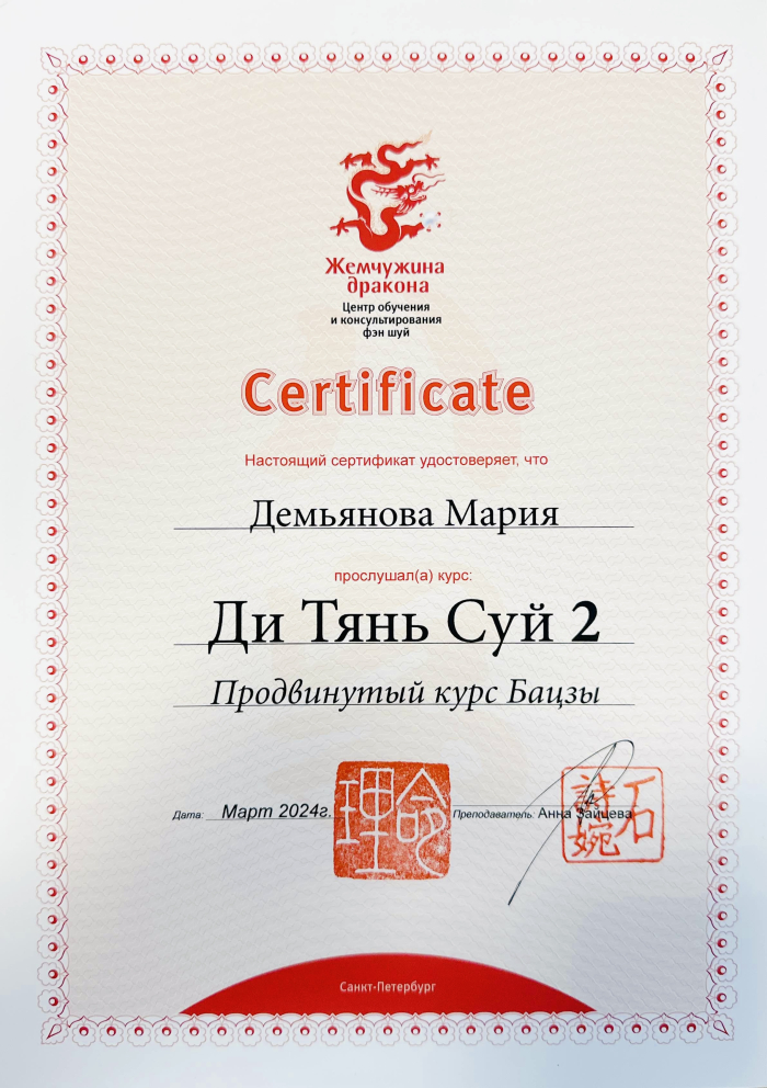 Также я состою в Клубе фэн шуй, Клубе бацзы и Клубе ци мэнь школы Mingli, что позволяет дальше совершенствовать свои практические навыки, и я рада быть частью дружной команды.