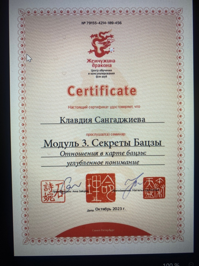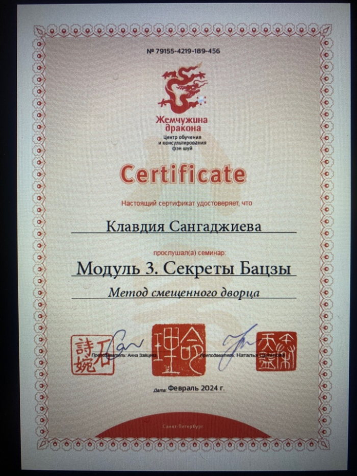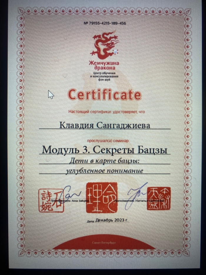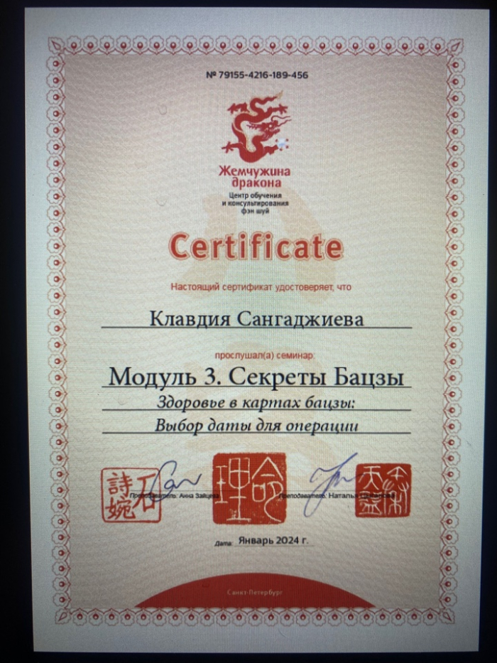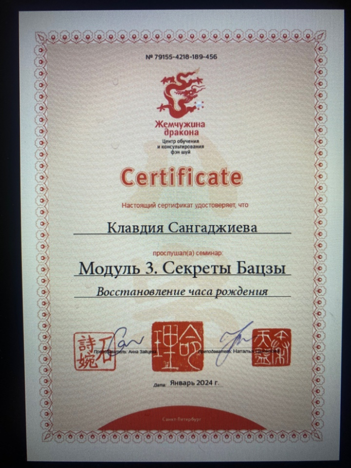 Меня зовут Клавдия, я сертифицированный консультант по Бацзы от центра обучения и консультирования "Жемчужина Дракона". С января 2023 года прошла все обучающие курсы по Бацзы на Минли. С осени 2023 года успешно провожу консультации. От всей души благодарю за полученные знания преподавателей, Анну Зайцеву и Наталью Цыганову. На данный момент продолжаю обучение на курсе по фэн шуй на Минли.